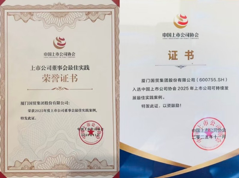 廈門(mén)國貿榮獲“2025上市公司董事會(huì )最佳實(shí)踐案例”和 “2025上市公司可持續發(fā)展最佳實(shí)踐案例”兩項榮譽(yù)。